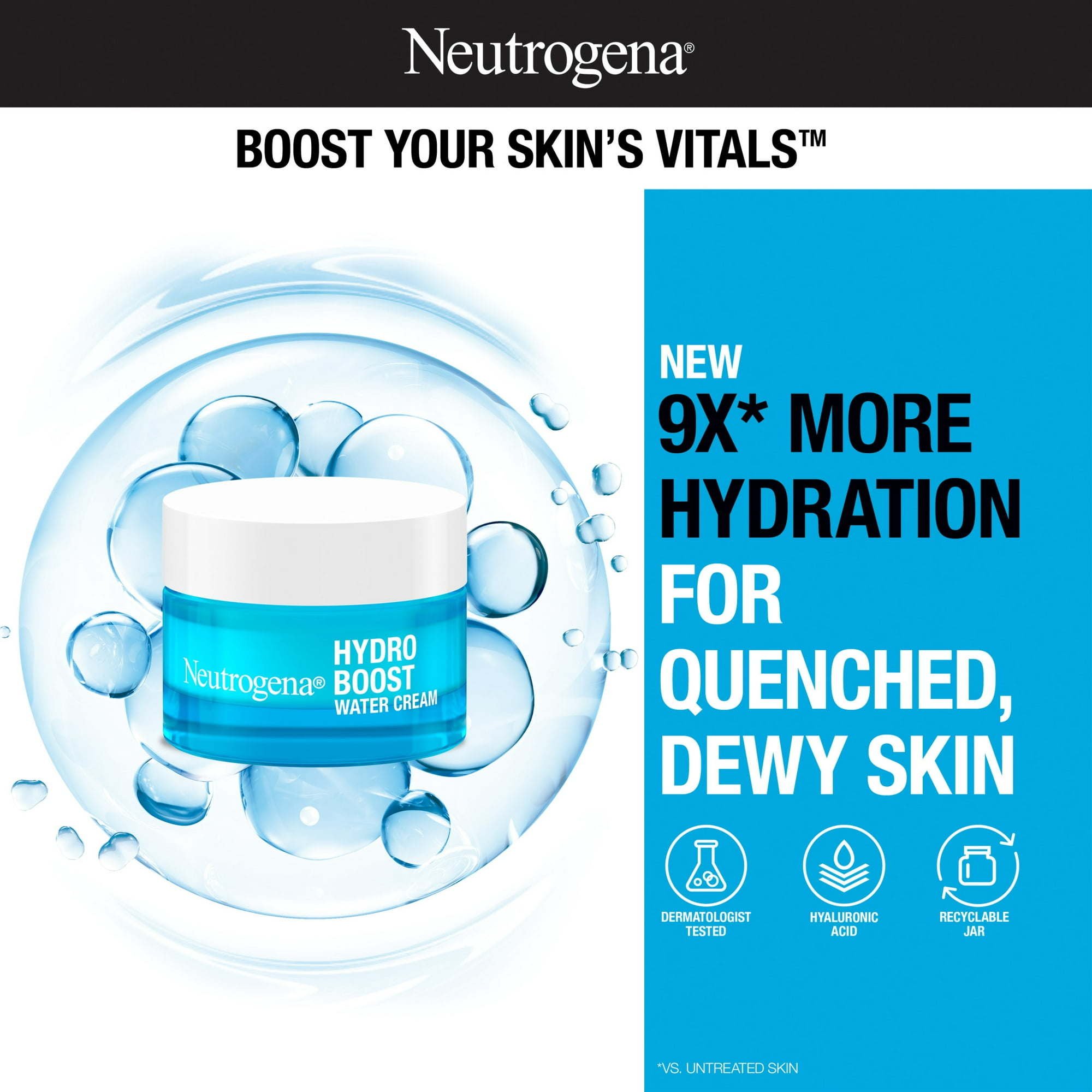 Neutrogena Hydro Boost Water Cream with hyaluronic acid replenishes vital water content within skin's surface for glowing skin. Ideal for dry, sensitive, & acne-prone skin, this face cream from a dermatologist-recommended skin care brand instantly delivers 9x more hydration for quenched, dewy skin (vs. untreated skin). The lightweight face moisturizer is formulated with hyaluronic acid, dermatologist-recommended hydrator that binds to water & hold it within the skin's surface, plus Natural Moisturizing Factors, including amino acids and electrolytes, to help hydrate skin, and essential lipids to help smooth skin's surface. The velvety cream is clinically proven to hydrate skin for 72 hours, leaves skin feeling plump & glowing in two weeks & more resilient in four weeks. The daily face moisturizer is free of fragrance, dyes, parabens, phthalates, & non-comedogenic, so it won't clog pores. To use as part of your skin care routine, apply the hydrating cream to face & neck after cleansing.