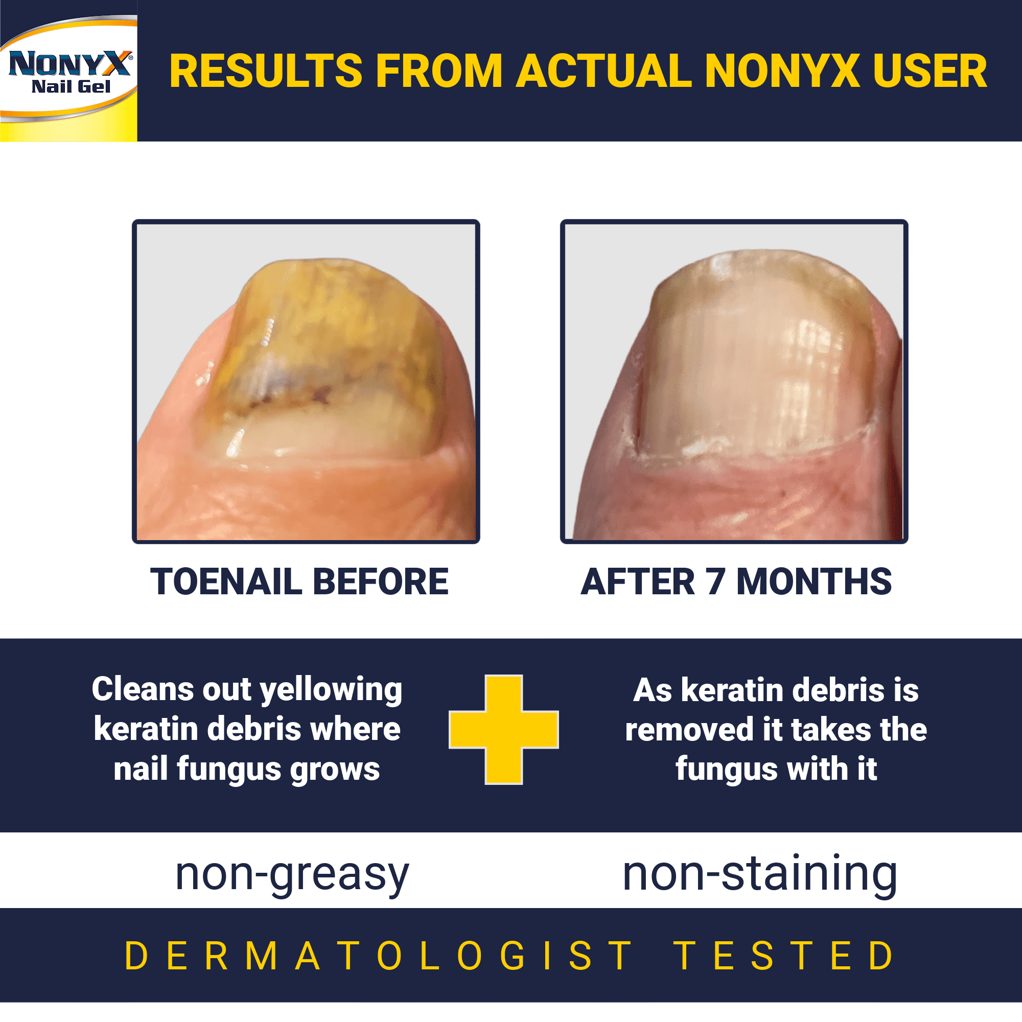 Nonyx Fungal Nail Clarifying Gel clears out fungus by removing keratin debris where nail fungus grows. Unlike other toenail fungus treatments, Nonyx works by targeting the food supply of nail fungus. This food is keratin debris. Once keratin debris is gone (and nail fungus with it), nails look clear and healthy again. In fact, Nonyx is clinically proven effective in a 9-month study where 90% of nail appearance significantly improved. Nonyx is an effective nail solution for damaged and discolored fingernails and toenails and clears nails that are yellow, thick, dark, brittle, or lifting. Nonyx has been a leader in nail care since 2006. The formulation (ingredients are Deionized water; ethanoic acid; xanthan gum; fragrance) is vegan, not tested on animals, is free of animal byproducts, parabens & preservatives.