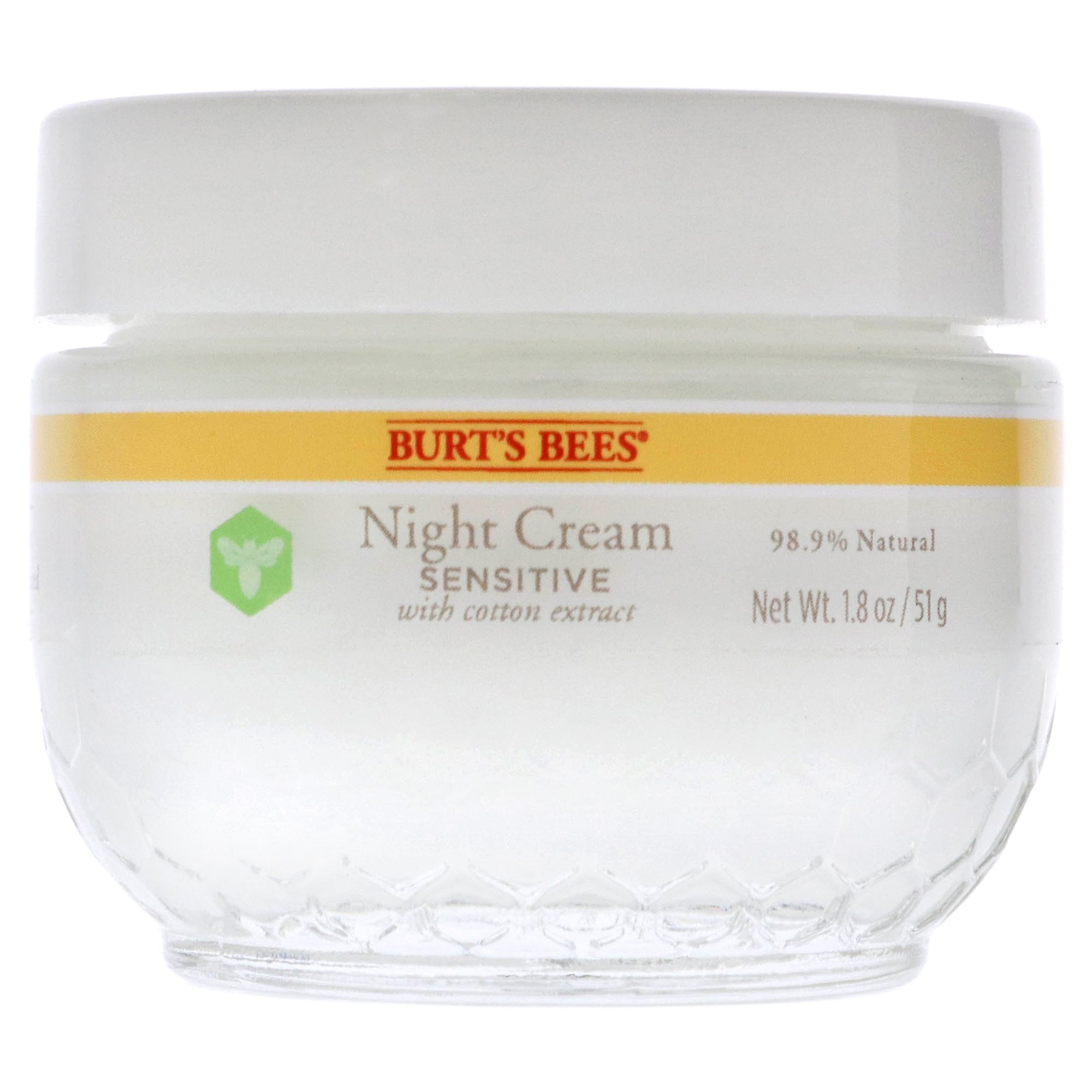 Naturally gentle and skin friendly; Burts Bees sensitive night cream provides proven hydration without worry of irritation. Ingredients such as cotton extract and aloe work together to rejuvenate skin; easing the stresses of the day.